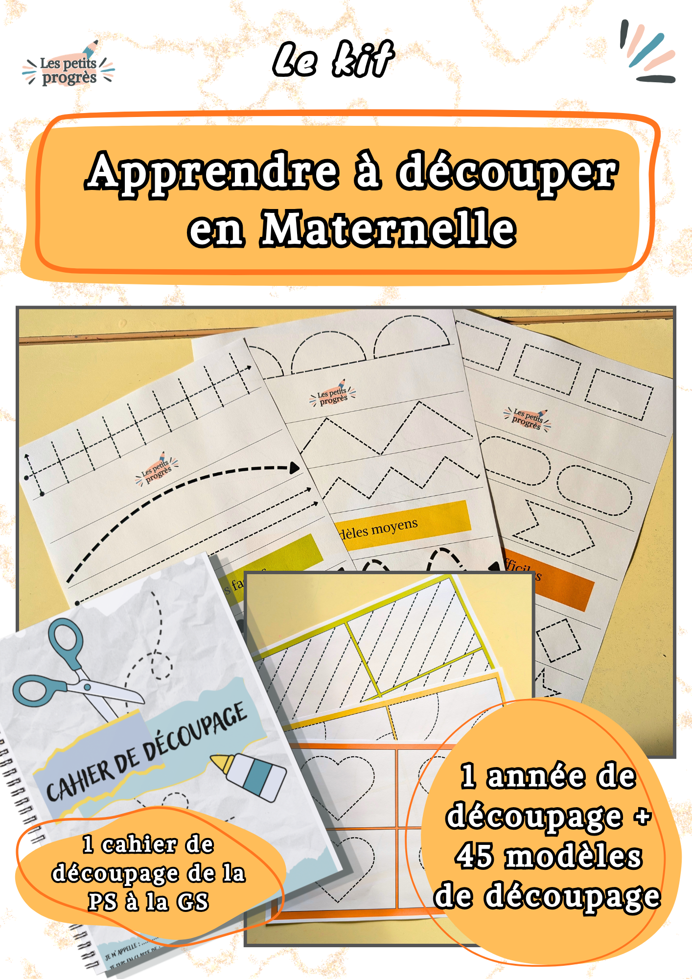 Le kit "Apprendre à découper en Maternelle" guide tes élèves pas à pas grâce à 4 modules progressifs. L'Introduction pose les bases essentielles du découpage en maternelle. Module 1 "Les activités pré-découpage". Module 2 "Les premiers découpages". Module 3 "Les découpages à niveaux" (45 modèles du plus simple au plus expert.) Module 4 "Le cahier de découpage"