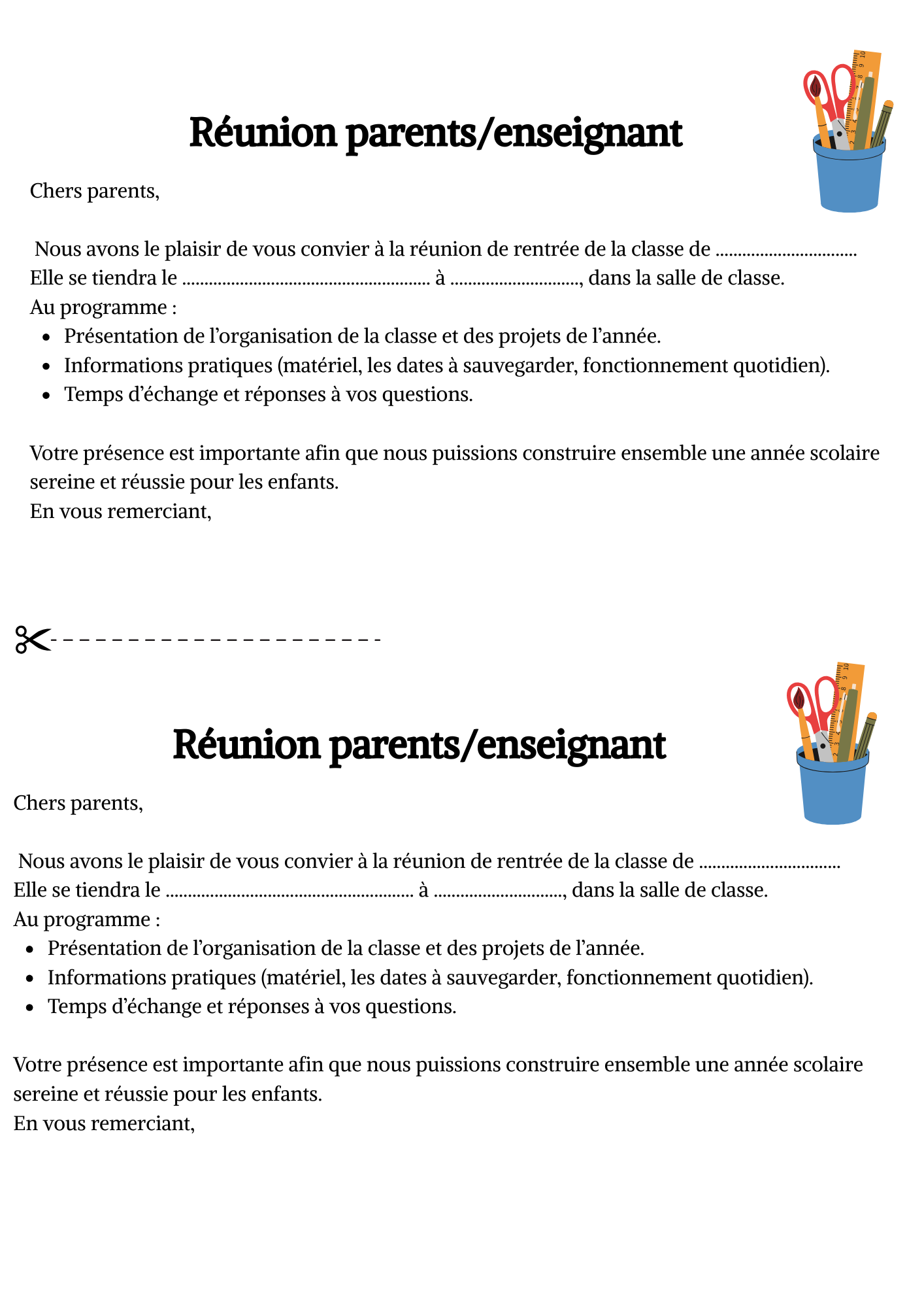 anniversaire d’un élève, petit bobo, retard, absence, demande de matériel, accompagnement en sortie ou annonce de réunion.