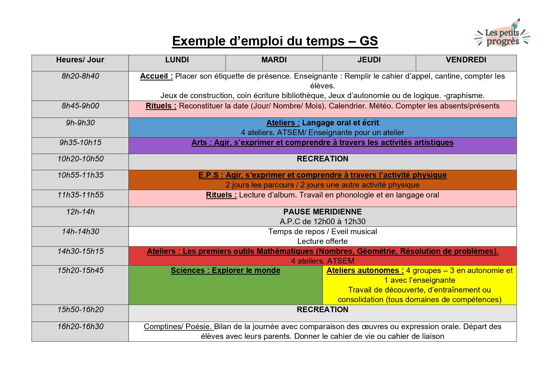 Des emplois du temps complets (PS, MS, GS, MS/GS), un calendrier grand format et des pictogrammes pour donner du rythme à l’année.